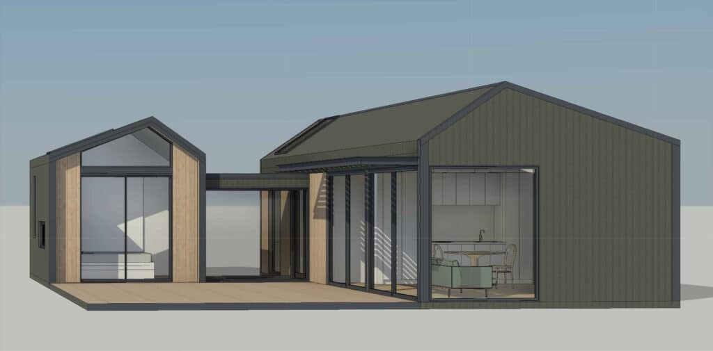 Our modular homes are built around flexibility, offering a smart system that adapts to your site, lifestyle, and future needs. Designs range from a compact one-bedroom home to a generous two-bedroom layout, with the second bedroom either articulated via a glazed corridor or added seamlessly to either end of the main module, extending the home by approximately 3.5 metres. Each configuration can be mirrored or adjusted to suit orientation, access, and personal preference.