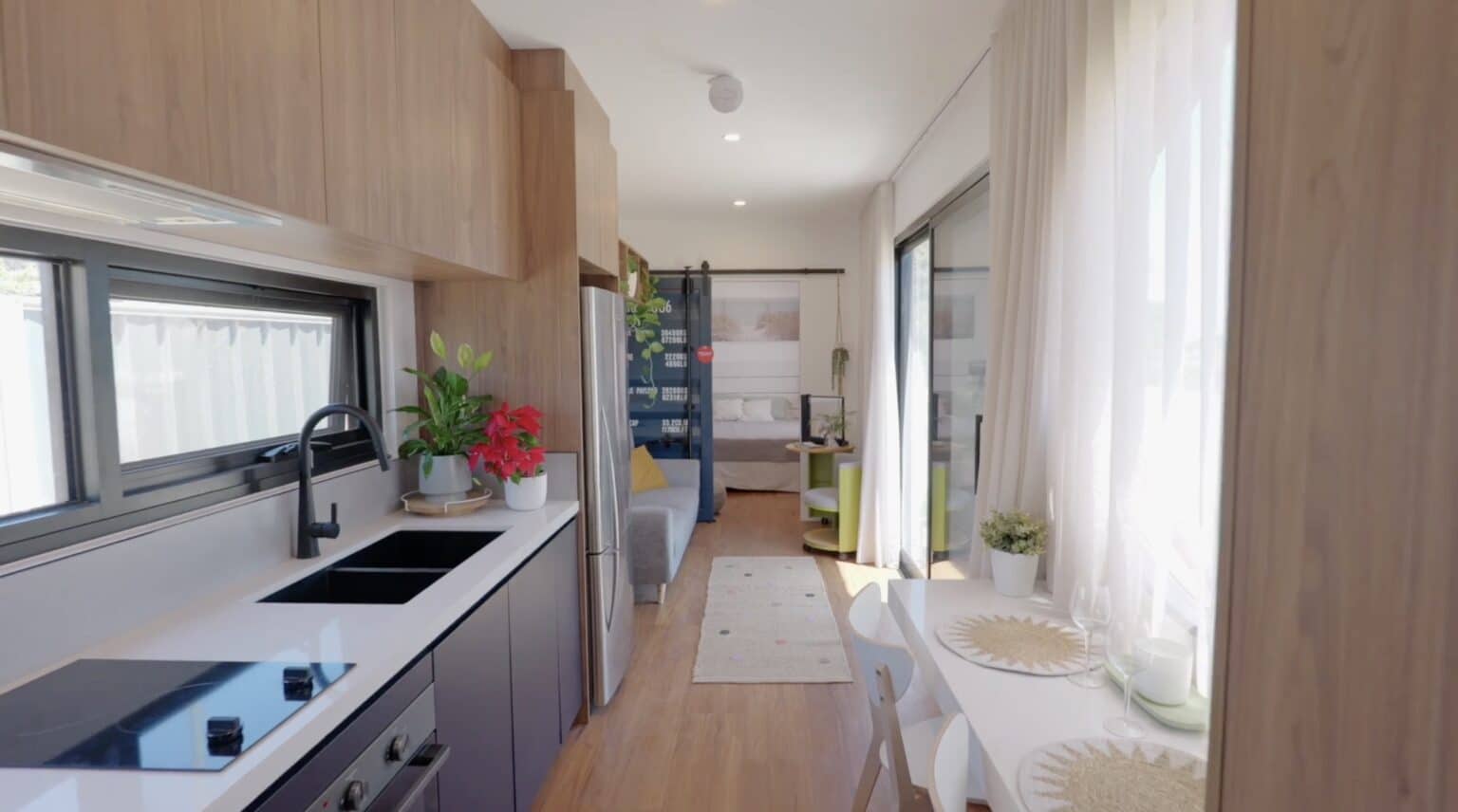 The walls and ceiling are insulated with 70mm PUR panels (Premium) + 32mm PUR infills and the underfloor with optional Polyester. We only use thermally-broken double glazing with high end design finishes. The practical layout features a double bedroom, a full kitchen with breakfast bar, a spacious bathroom with laundry, a lounge area and a utility compartment for tools, hot water and ar-con systems.